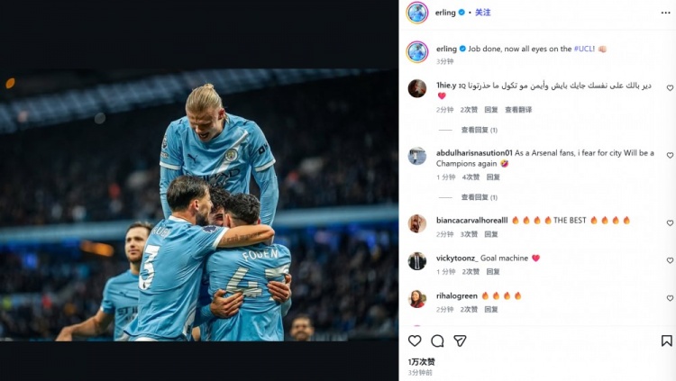 哈兰德本赛季各项赛事23场贡献23球4助攻,曼城将在下轮欧冠客战皇马。